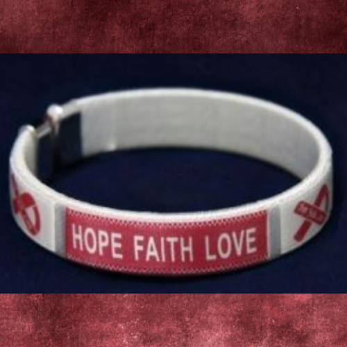 These burgundy ribbon awareness bracelets are flexible bangles that have burgundy ribbons with the words "Hope, Faith, Love." Each bracelet is approximately 7 1/2" and come in a package of 5 for $24.00